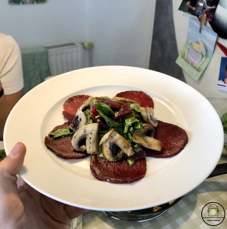 Second Step: Cut the mushrooms into your desired shaped and sautee them in butter or olive oil. Let both your mushrooms and rootbeet cool off before throwing them into the salat. the steam of the veggies would hurt the crunsh and freshness of the salat leaves.